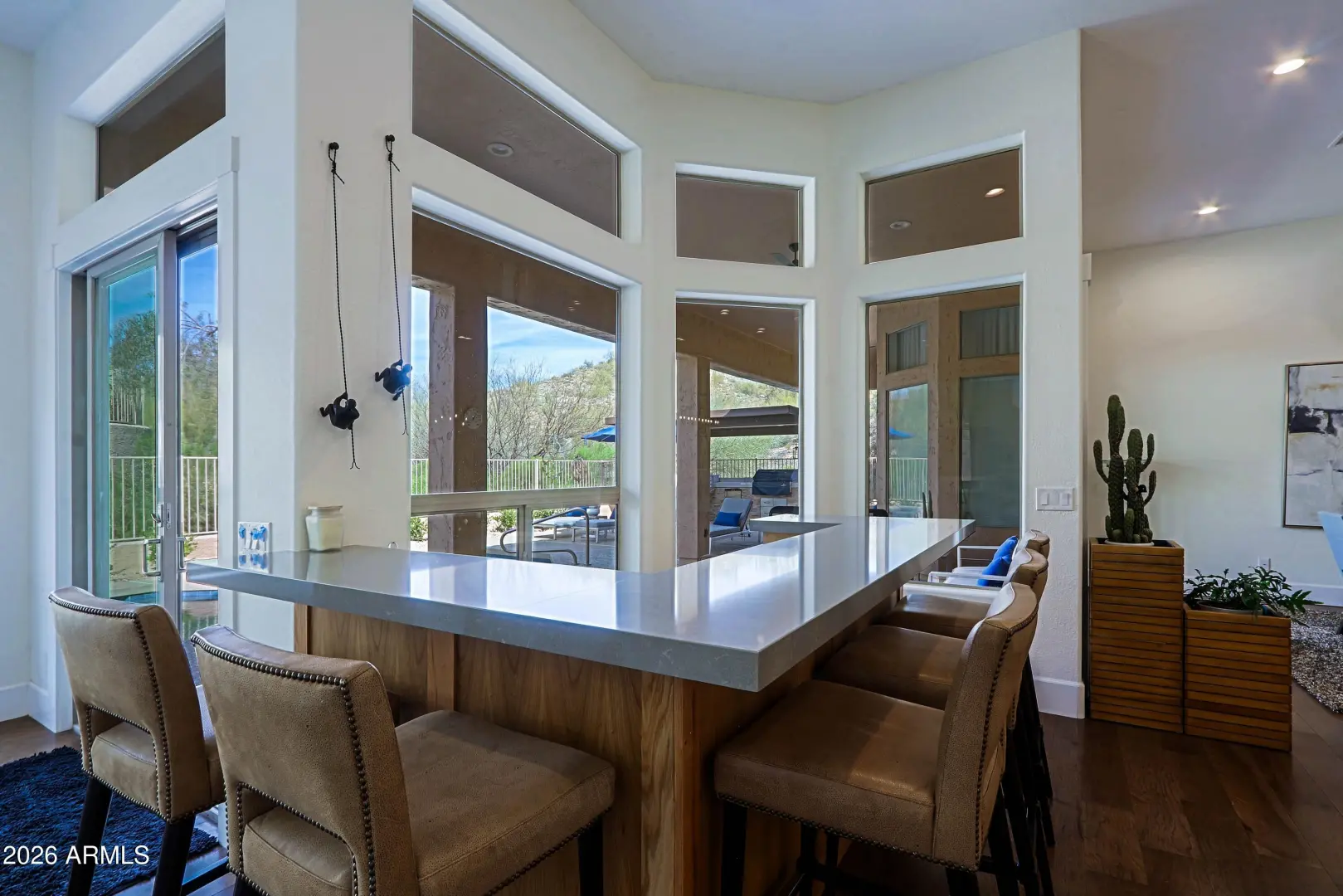 Don't miss this opportunity to own a completely remodeled home in a highly sought after Troon neighborhood. The home was elegantly re-designed creating a light and bright open floor plan using high end contemporary finishes including automated blinds. Upon entering, there is a chic glassed-in wine room or office w/ built-in cabinetry and a large formal dining room with sliding doors that open to a spacious covered patio. An entertaining bar that features beautiful mountain views is the hub of the main living area. The bar leads to a state of the art kitchen with built-in subzero refrigerator, gas cooktop, double wall ovens and a gorgeous island w/breakfast bar seating. The family room boasts a modern fireplace w/ cabinetry & shelving on either side and windows above that showcase
