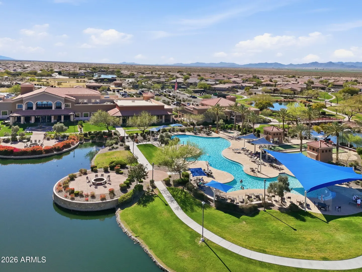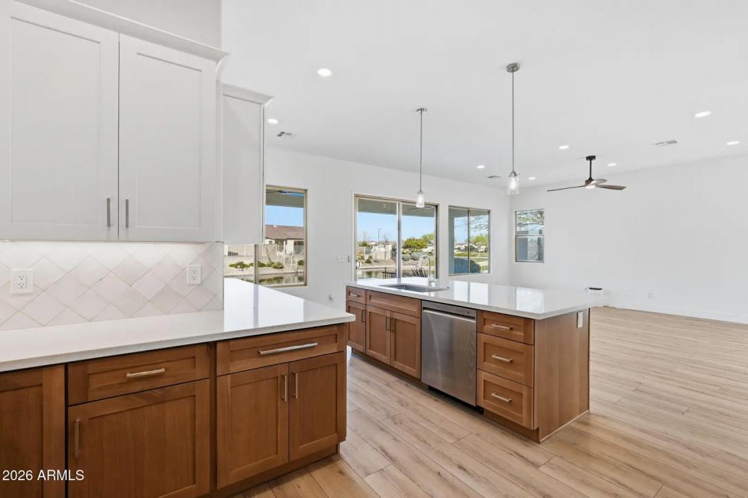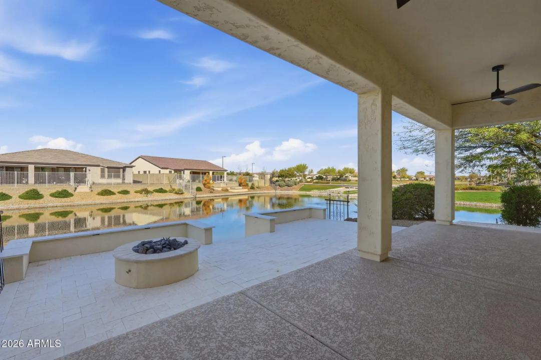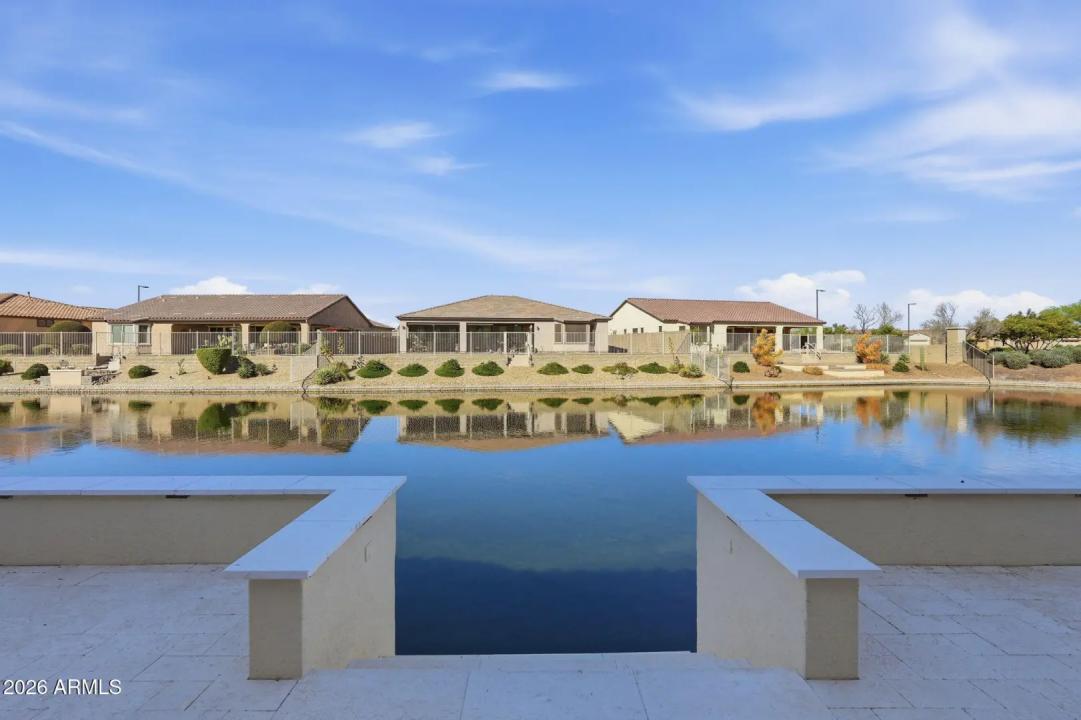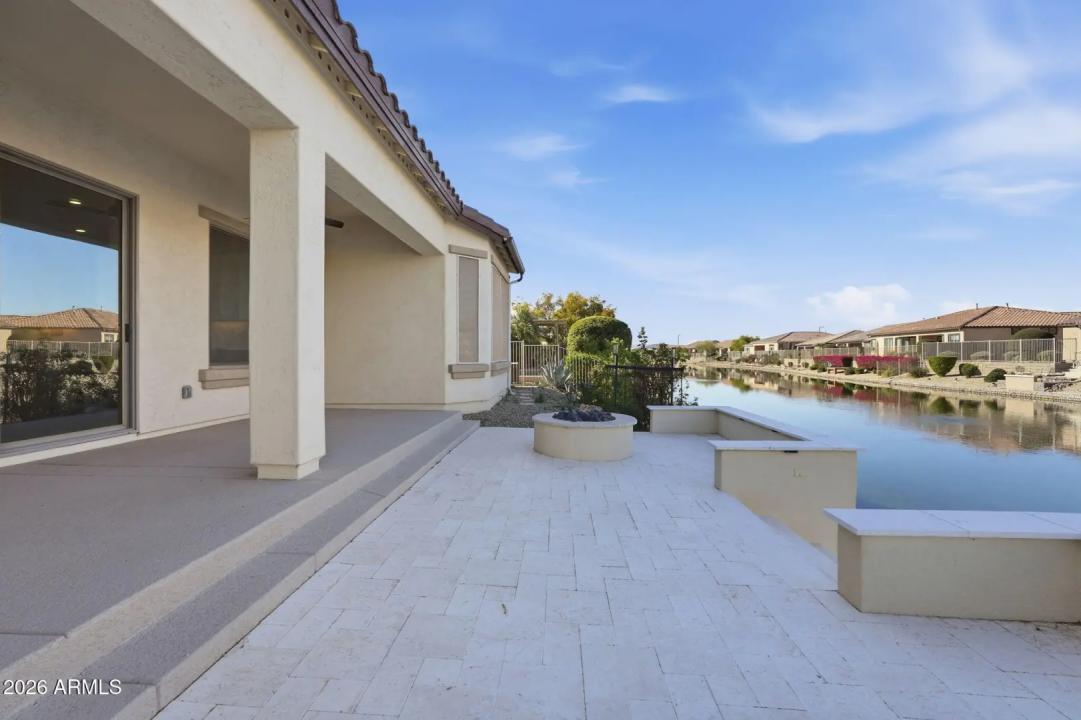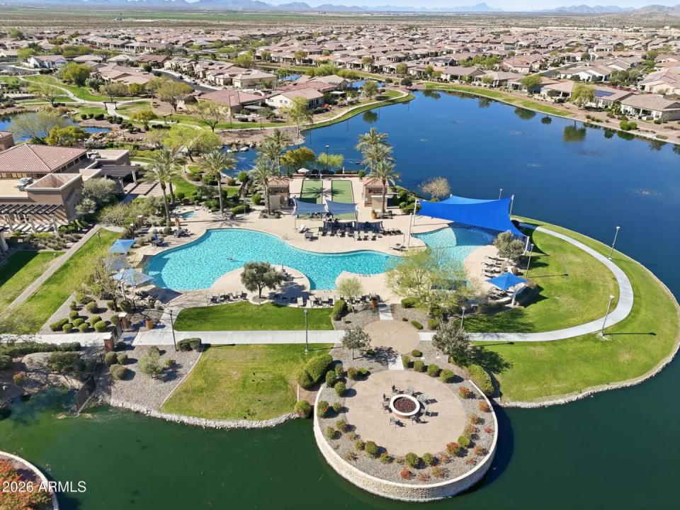 Stunning lakefront retreat in the heart of CantaMia at Estrella, Goodyear's premier guard-gated 55+ community! This exceptional Ballad floorplan commands one of the most coveted positions in the neighborhood, a waterfront lot with open space on a second side delivering unmatched privacy and breathtaking lake & mountain views. Thoughtfully transformed top to bottom in 2025 with a gorgeous new kitchen, designer bathrooms and fresh flooring throughout -- simply move in and enjoy. Private guest suite with separate entrance is ideal for visiting family. Owned solar with zero lease obligation means dramatically reduced utility costs from day one. Spacious great room opens to covered patio where Arizona sunsets over the lake become your daily backdrop. World-class community amenities include