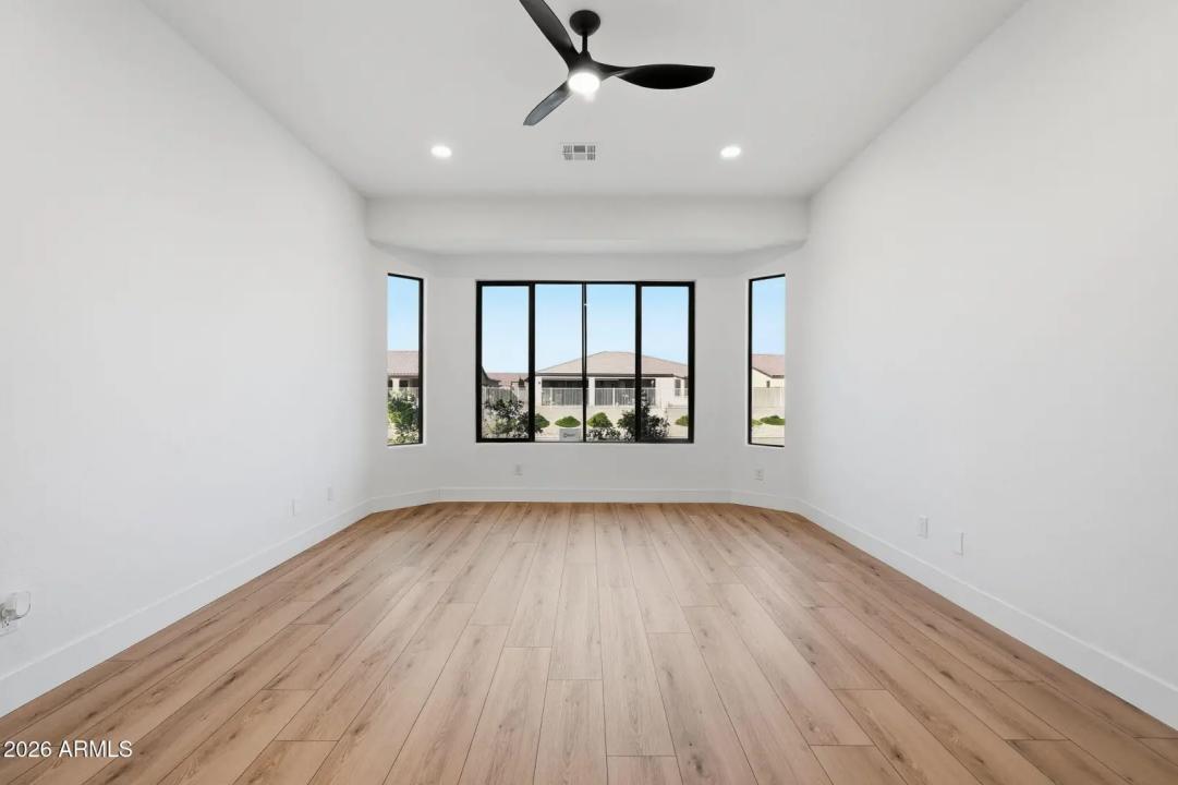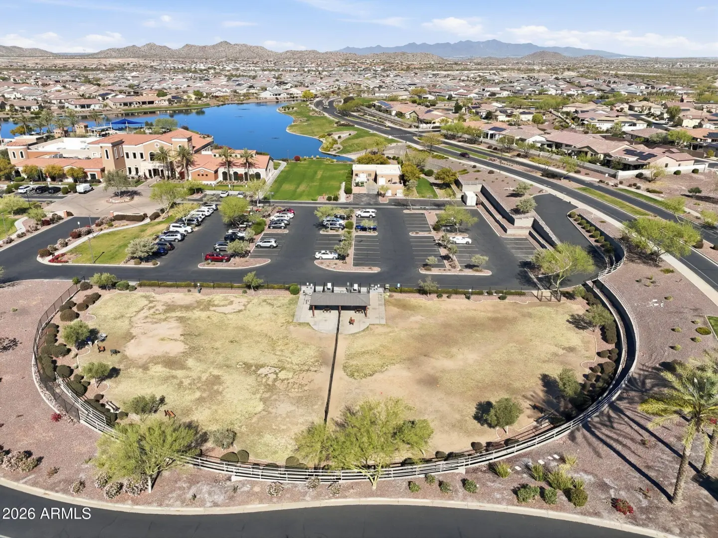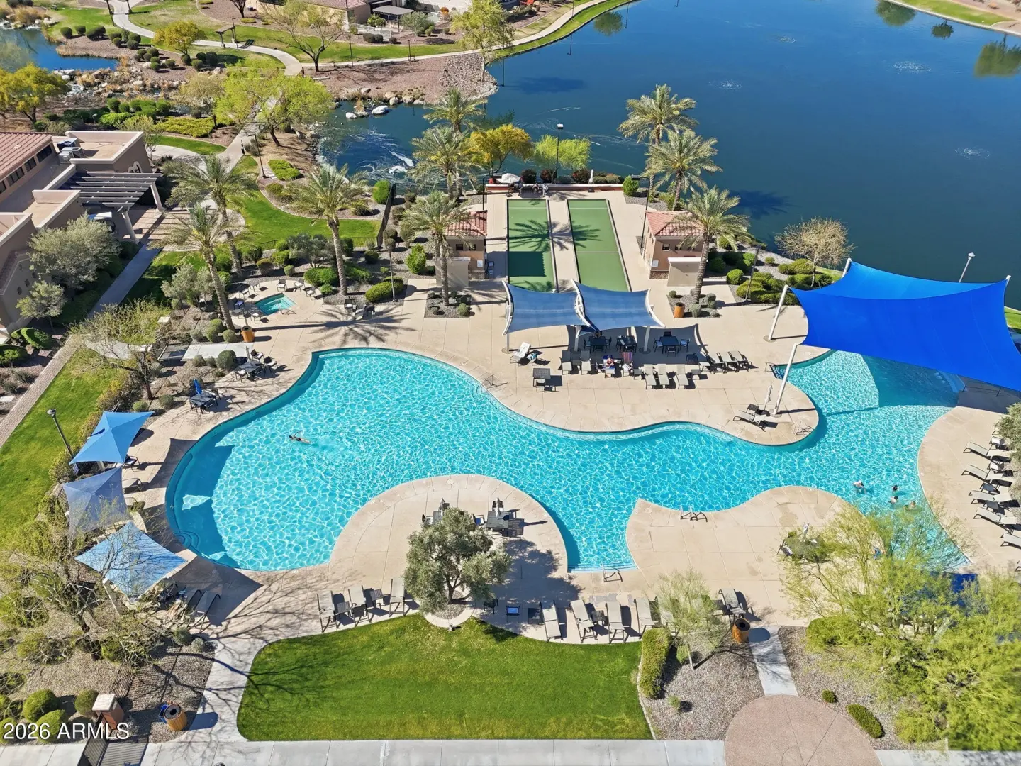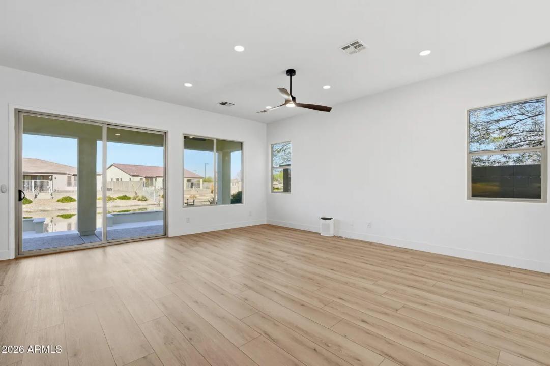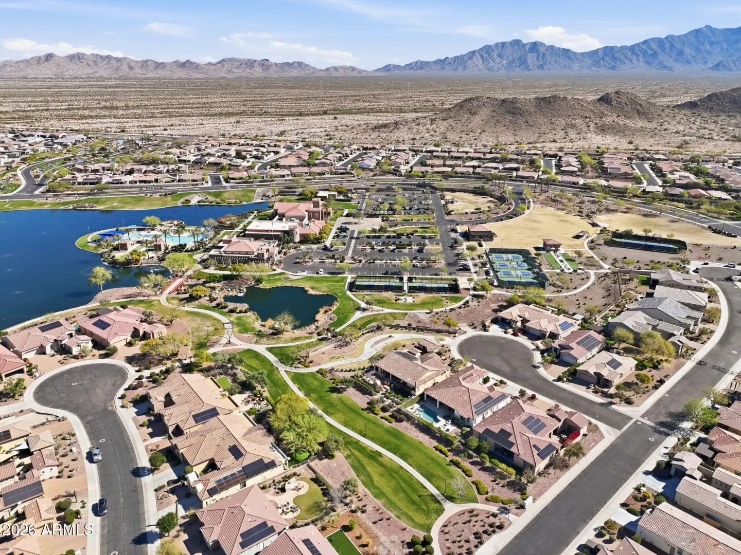 Stunning lakefront retreat in the heart of CantaMia at Estrella, Goodyear's premier guard-gated 55+ community! This exceptional Ballad floorplan commands one of the most coveted positions in the neighborhood, a waterfront lot with open space on a second side delivering unmatched privacy and breathtaking lake & mountain views. Thoughtfully transformed top to bottom in 2025 with a gorgeous new kitchen, designer bathrooms and fresh flooring throughout -- simply move in and enjoy. Private guest suite with separate entrance is ideal for visiting family. Owned solar with zero lease obligation means dramatically reduced utility costs from day one. Spacious great room opens to covered patio where Arizona sunsets over the lake become your daily backdrop. World-class community amenities include