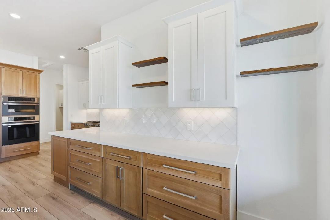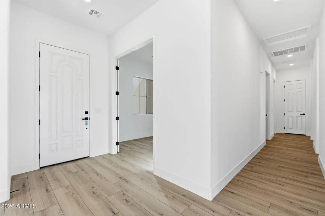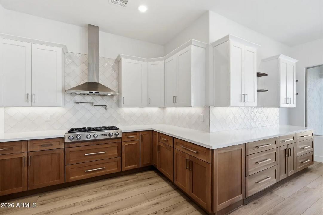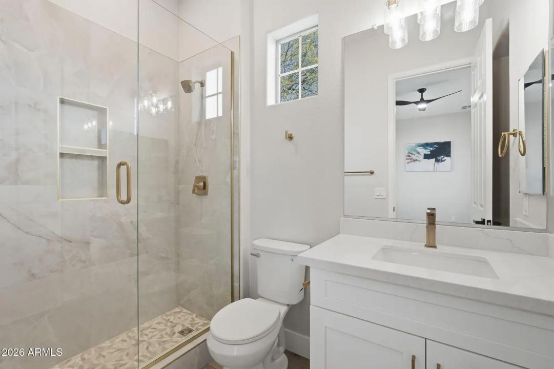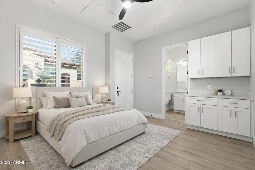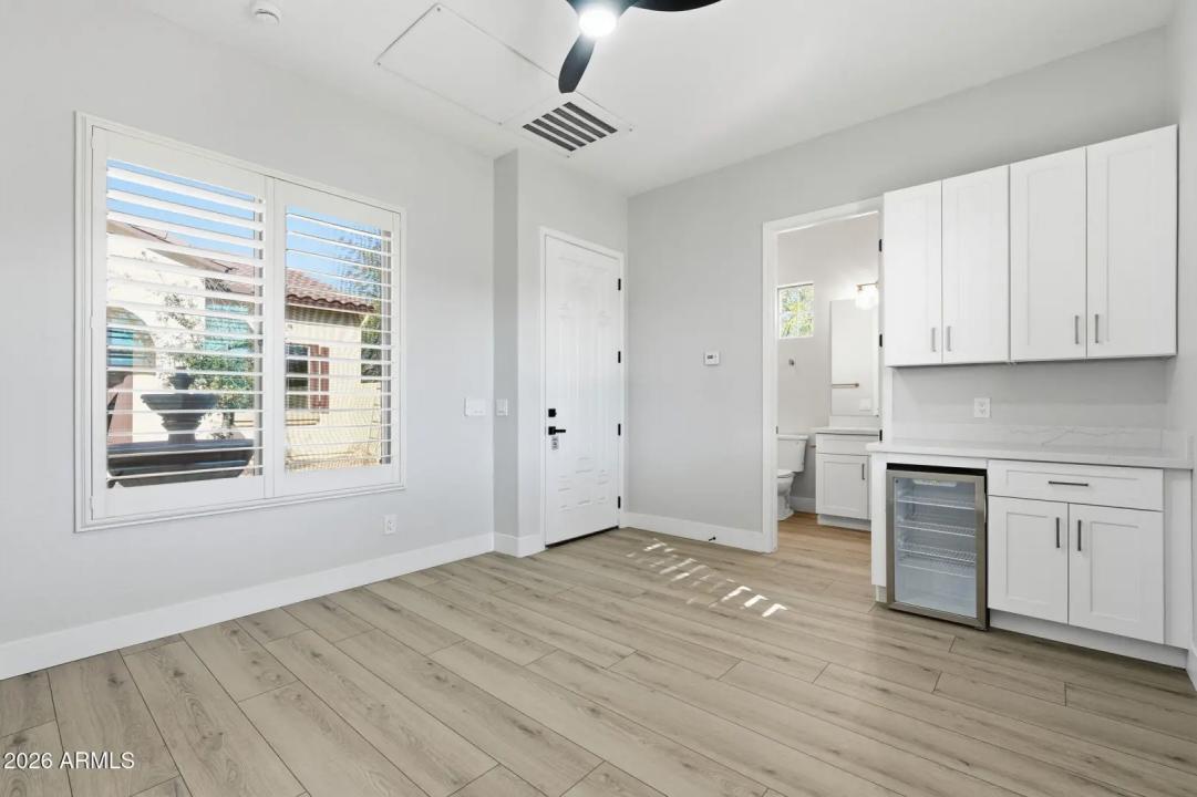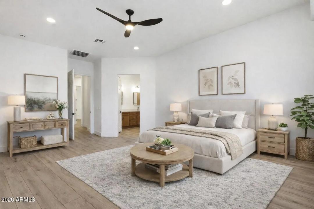 Stunning lakefront retreat in the heart of CantaMia at Estrella, Goodyear's premier guard-gated 55+ community! This exceptional Ballad floorplan commands one of the most coveted positions in the neighborhood, a waterfront lot with open space on a second side delivering unmatched privacy and breathtaking lake & mountain views. Thoughtfully transformed top to bottom in 2025 with a gorgeous new kitchen, designer bathrooms and fresh flooring throughout -- simply move in and enjoy. Private guest suite with separate entrance is ideal for visiting family. Owned solar with zero lease obligation means dramatically reduced utility costs from day one. Spacious great room opens to covered patio where Arizona sunsets over the lake become your daily backdrop. World-class community amenities include