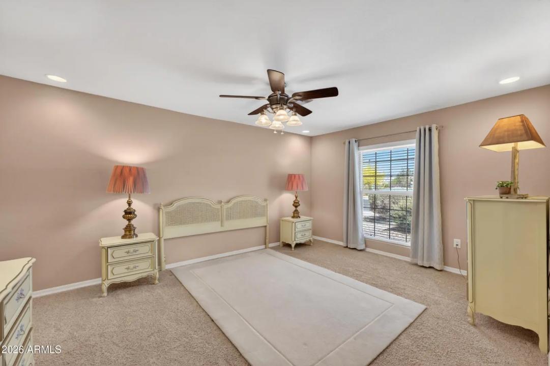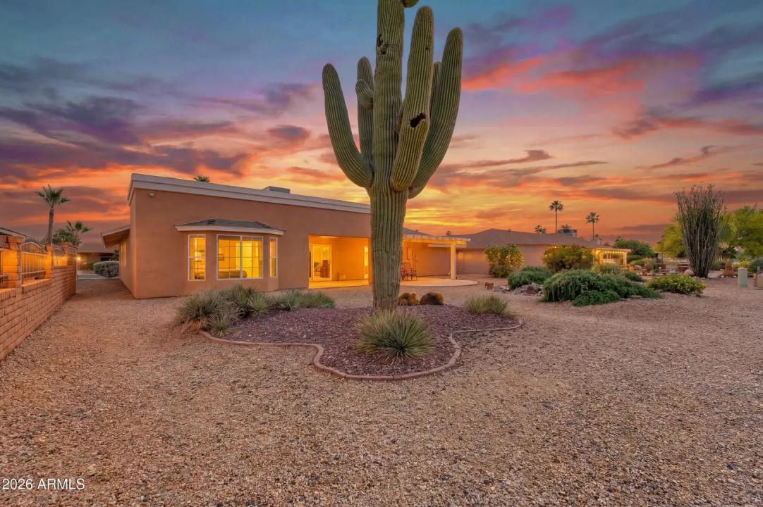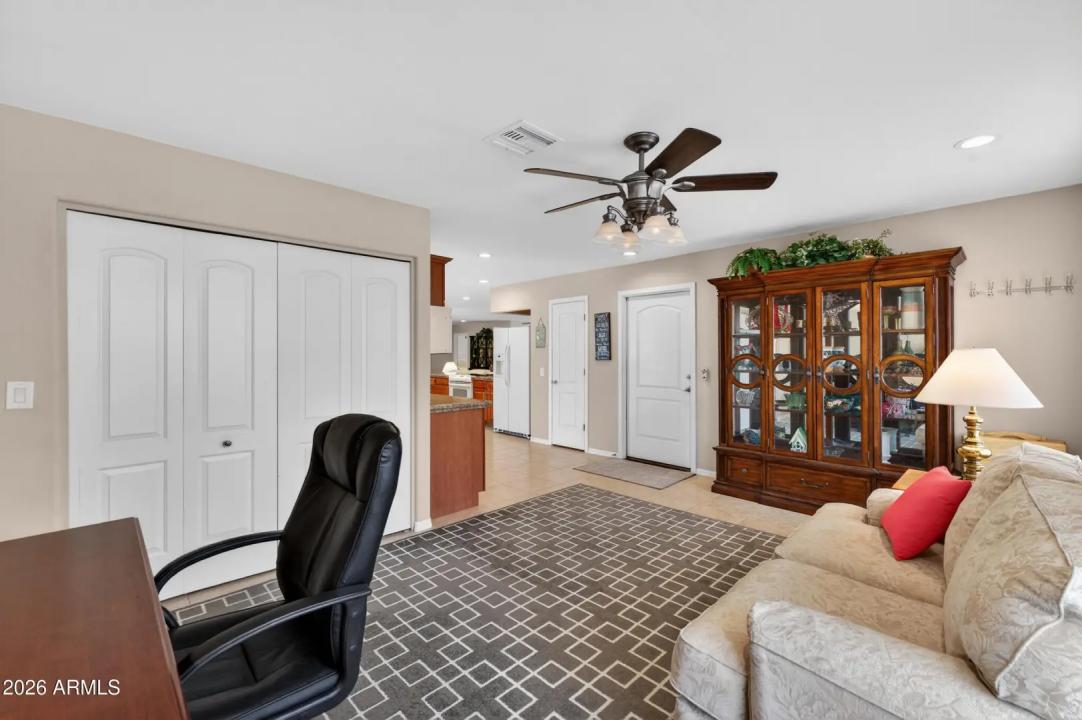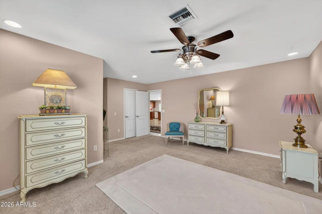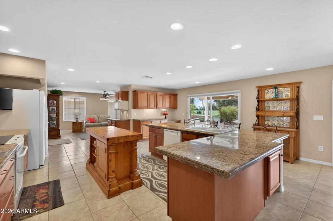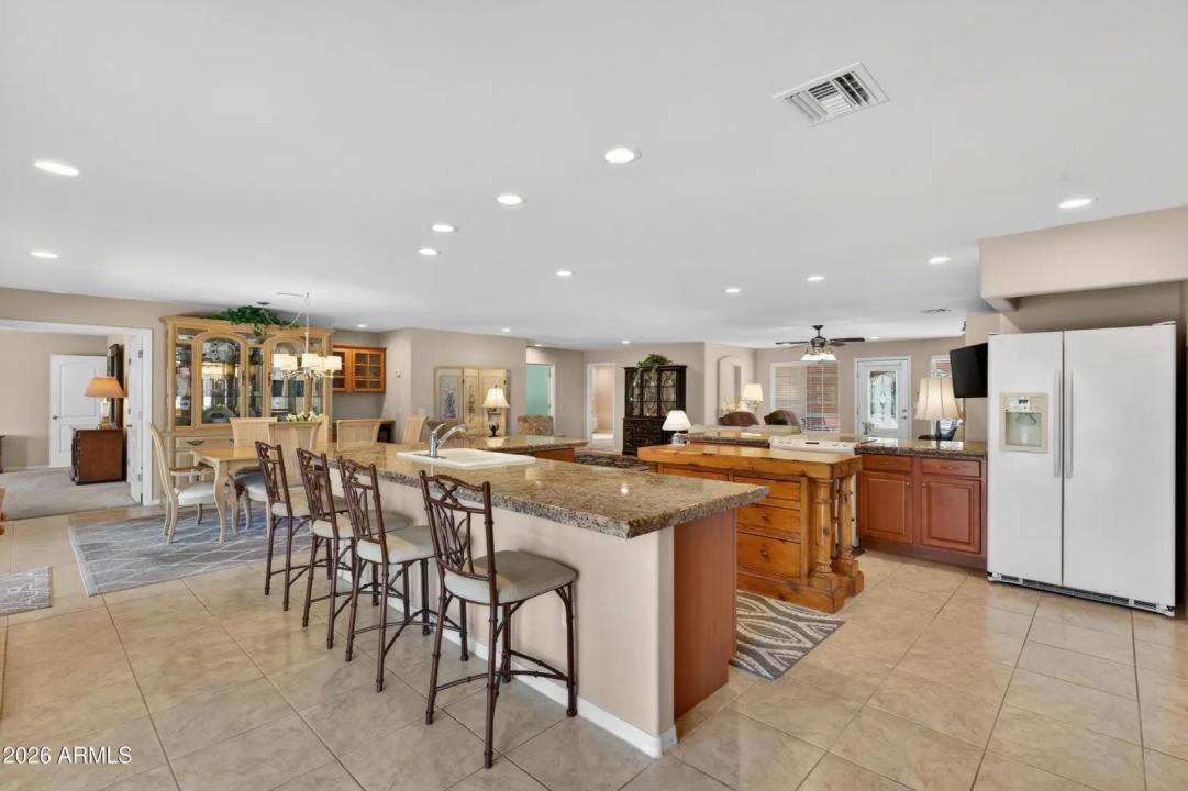 Custom model home on the 7th fairway with golf course views, stunning sunsets, and no HOA. This spacious Sun City West home features a very open floor plan with a large great room concept, ideal for both everyday living and entertaining. The split layout offers 2 primary suites with ensuites, separated by a versatile 3rd room that can serve as a bedroom, office, or den. An additional TV/den/craft room off the kitchen adds flexibility for hobbies, guests, or workspace. Large windows bring in natural light and frame the fairway views, while the custom design gives the home a distinctive feel. Lightly lived in by prior part-time owners and meticulously maintained over the years, with an extensive 2006 renovation. Rare golf course opportunity in a prime Sun City West location.