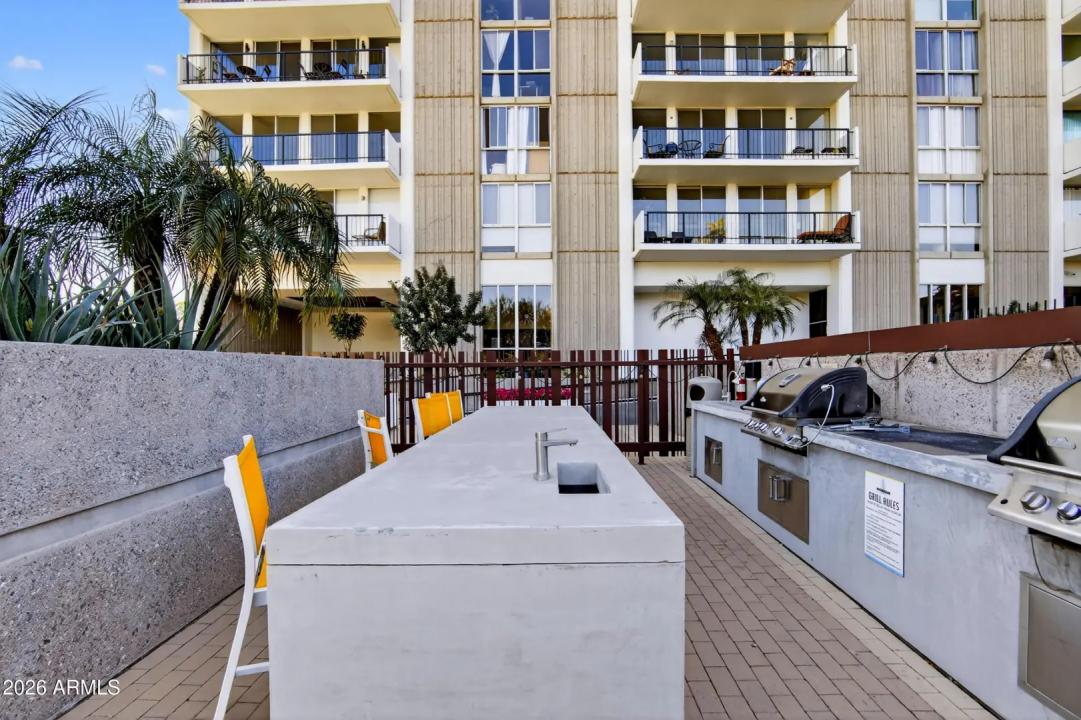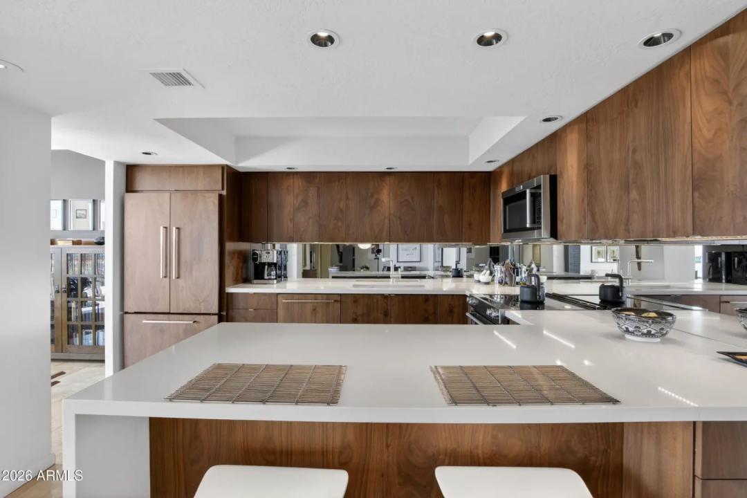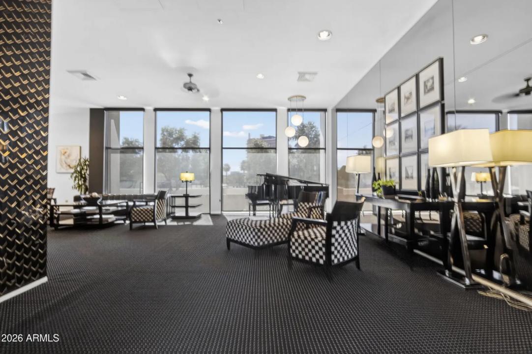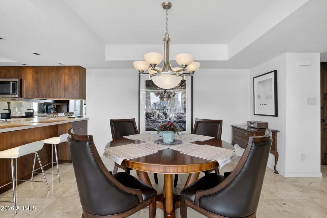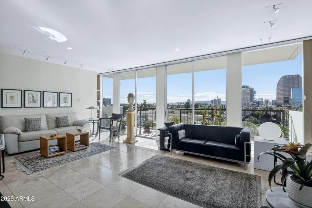 Wake up on the 6th floor to golden Arizona light pouring through floor-to-ceiling glass, with south-facing views overlooking the Heard Museum and the Phoenix skyline. This spectacular residence feels elevated, refined, and thoughtfully designed for both everyday comfort and unforgettable entertaining. The entry, kitchen, and dining areas have been completely renovated, creating stunning open-concept living. Custom walnut cabinetry and quartz counters anchor the design. The kitchen is as functional as it is beautiful. An inviting peninsula, perfect for prepping meals or enjoying breakfast, opens to the living area with stunning views. Sunshades, plantation shutters, and dual-pane insulated windows enhance privacy and energy efficiency.