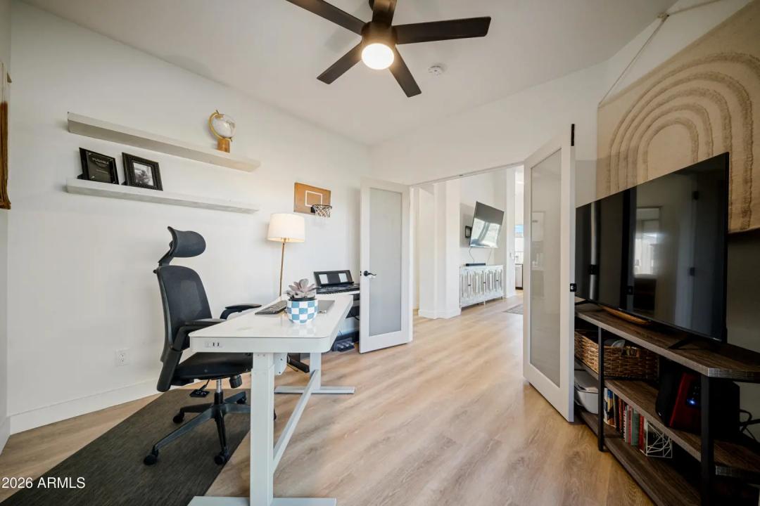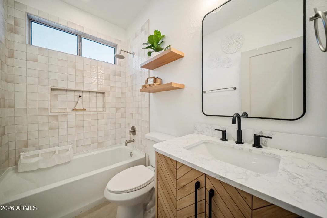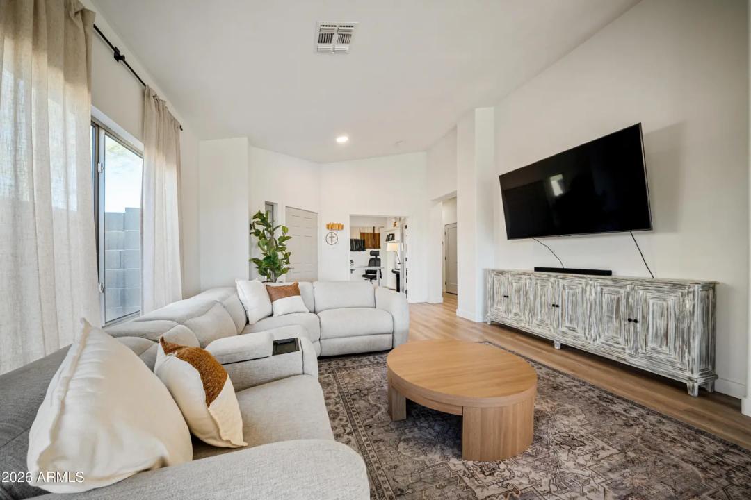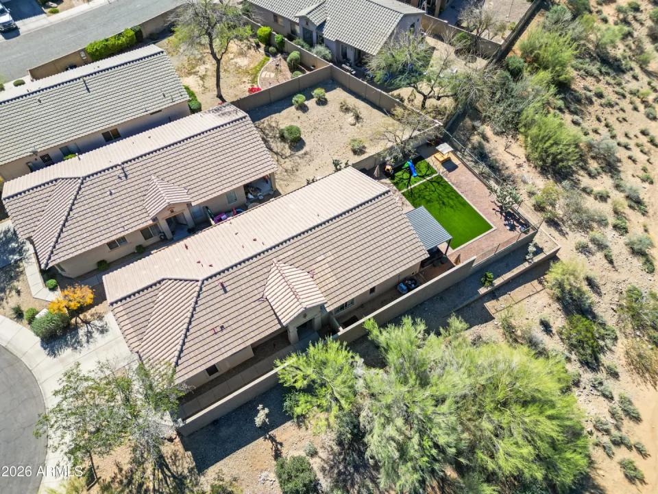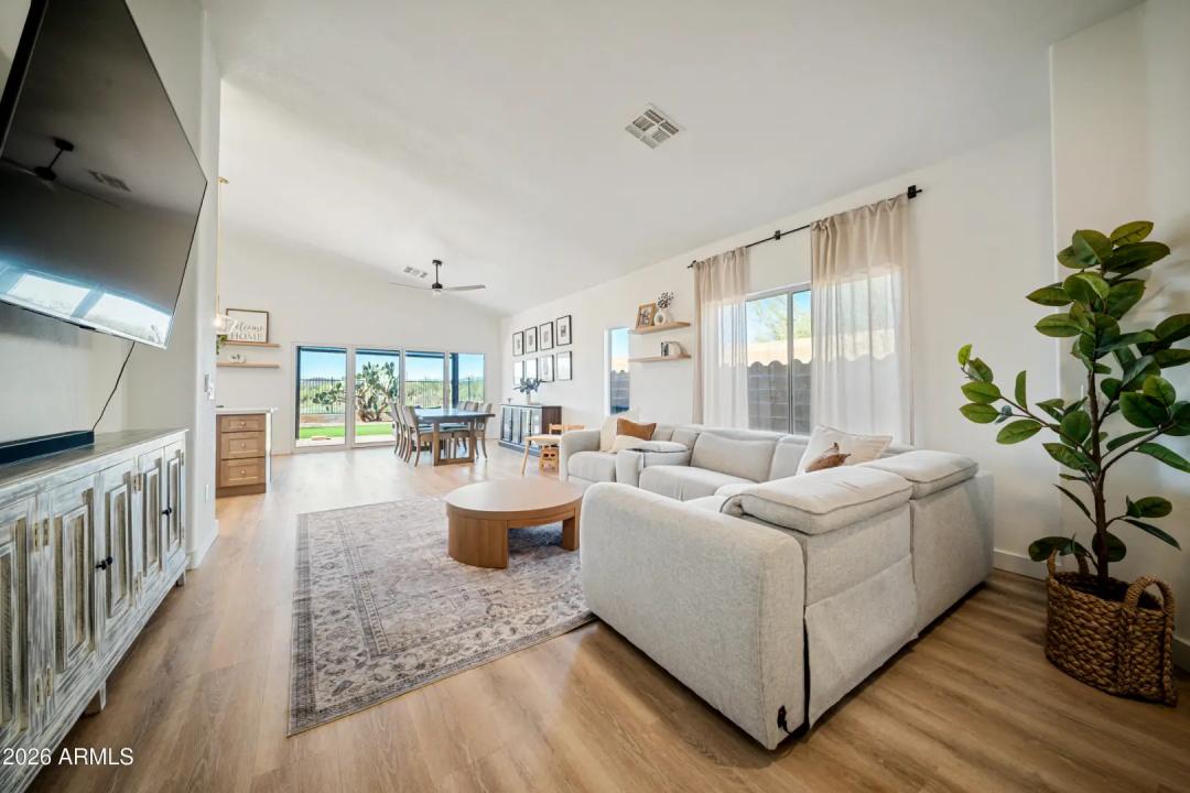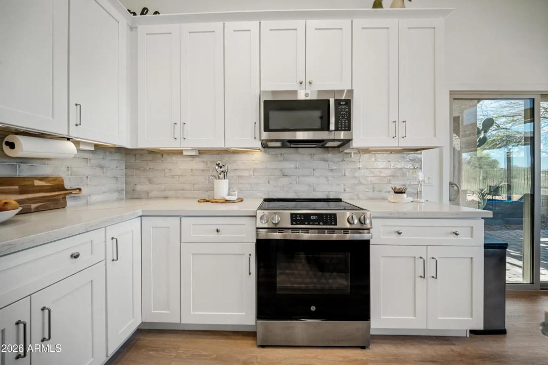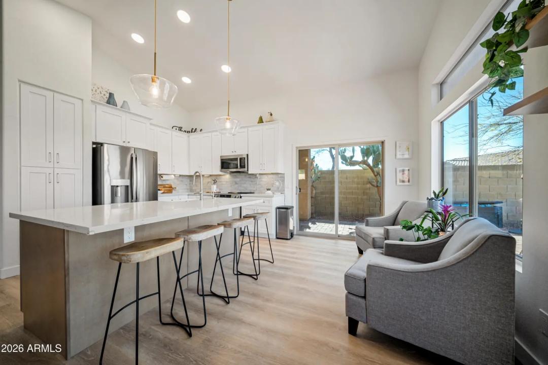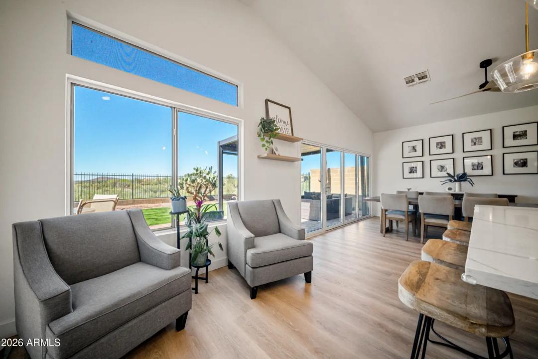Fully remodeled home on the best view lot in Anthem! New roof and new 4-ton Goodman A/C offer lasting peace of mind. The open-concept layout showcases luxury vinyl plank flooring, upgraded interior doors, adjustable recessed lighting, and a dramatic 4-panel folding slider that creates seamless indoor-outdoor living. The designer kitchen features quartz countertops, two-tone soft-close cabinetry, GE stainless appliances, farmhouse sink, under-cabinet lighting, and a 4-seat island with statement pendants. The split floor plan includes a spa-inspired primary suite with terrazzo floors, dual oak vanity, and floor-to-ceiling tiled shower. Enjoy a wrap-around paver patio, pergola, synthetic turf, drip irrigation, and epoxy-coated garage with storage. Turnkey and beautifully upgraded .