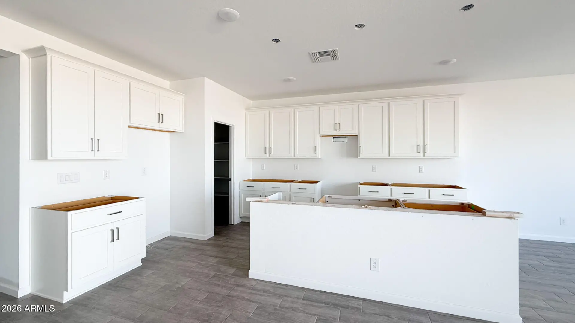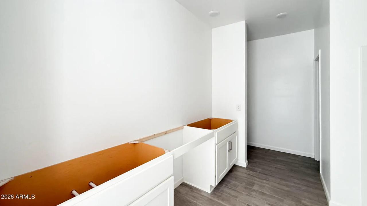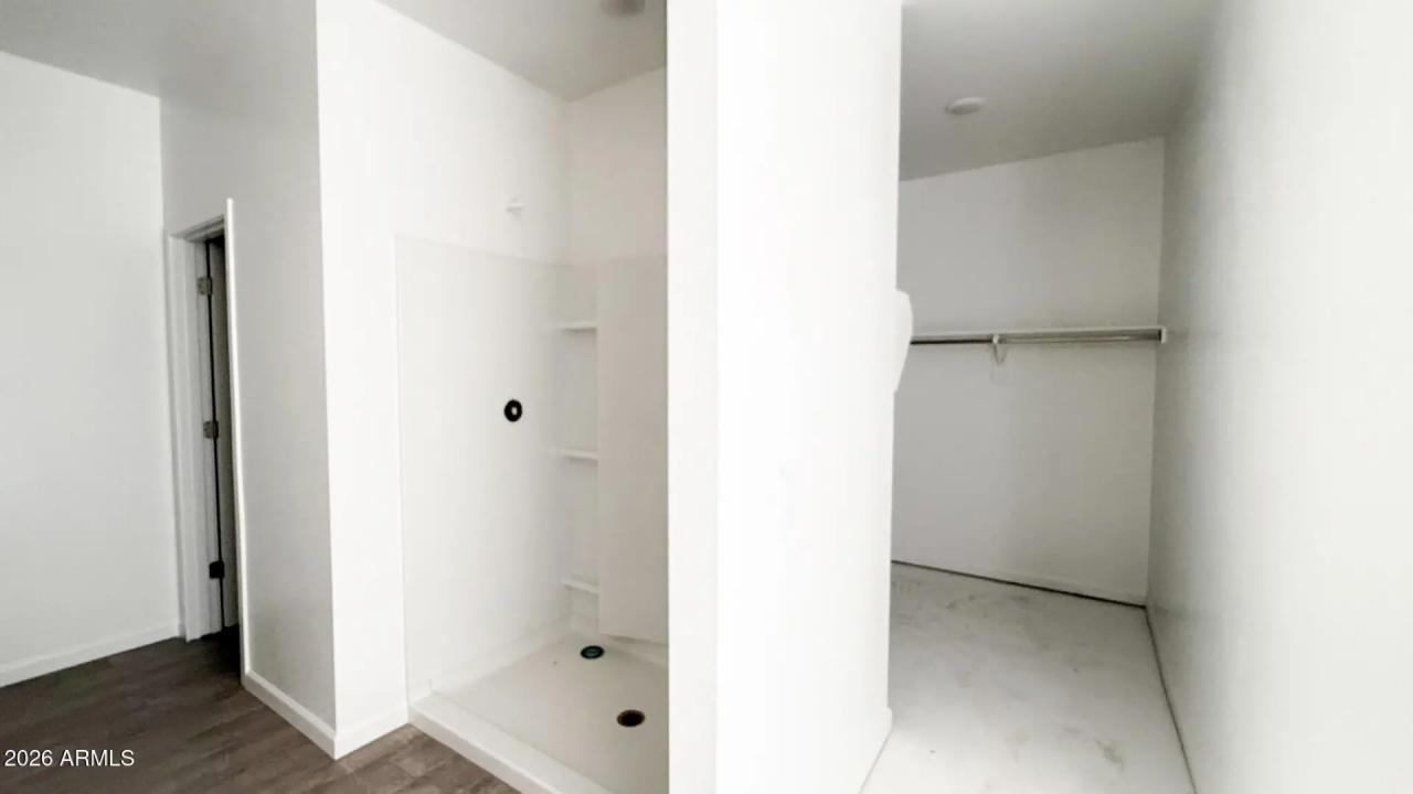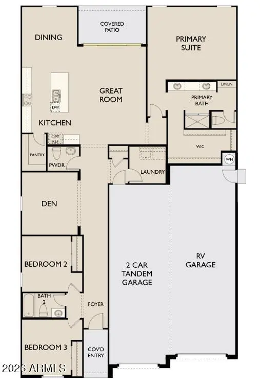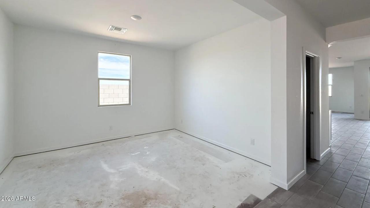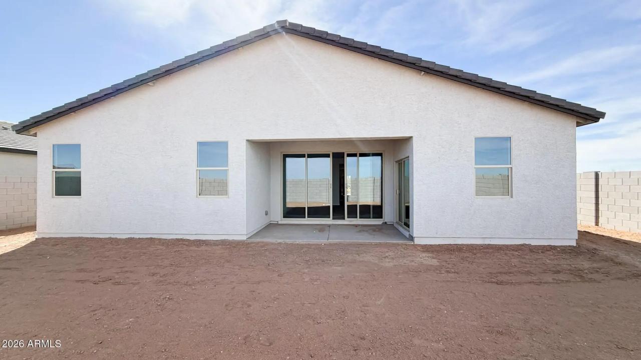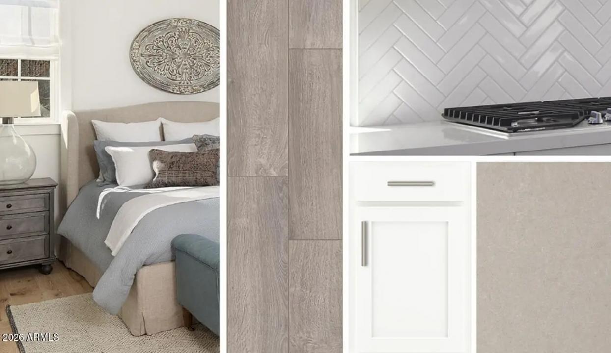 Sol at Amarillo Creek in Maricopa! 2,178sf, 3 bed, 2.5 bath + den on a premium corner lot with 8' gate and rare 4-car RV garage. Farmhouse elevation with Timeless Ashton Woods Collection. Features include white 42'' upper cabinets with satin nickel hardware, quartz countertops, white herringbone tile backsplash, wood-plank tile in common/wet areas, and stainless electric appliances incl. fridge + matching washer/dryer. Insulated RV garage, pendant light pre-wire, and 4-panel center slider for seamless indoor/outdoor living.