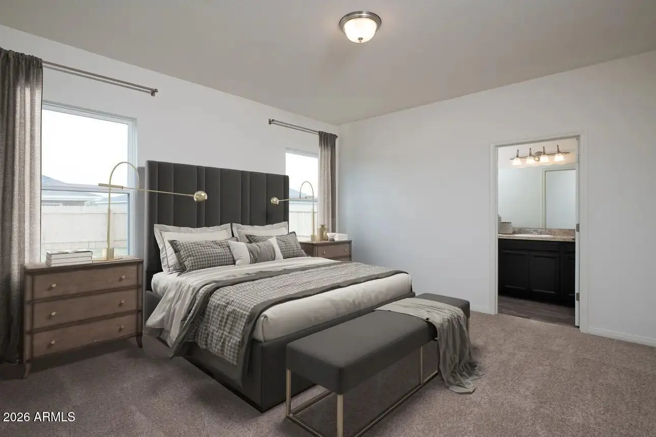Beautiful NEW Home in PRIME location, close to major cities. Move- in Ready in early April 2026. Featuring countless upgrades such as White Shaker Cabinetry, Granite Countertops, Stainless steel appliance package, and 9' ceilings throughout! Spacious walk - in closet in owners suite. Energy - efficient features including dual pane windows, WIFI programmable thermostats and insulated garage doors. Front yard landscaping package, covered patio and porch. Neighborhood parks, playgrounds, covered picnic tables and greenbelts throughout. Spectacular mountain views! Conveniently located near the 347 and I-10. Highly rated schools, shopping, and dining! Just 5 miles from Fry's, Walmart, and CVS! 10 minute drive from all shopping, dining, and recreation.
