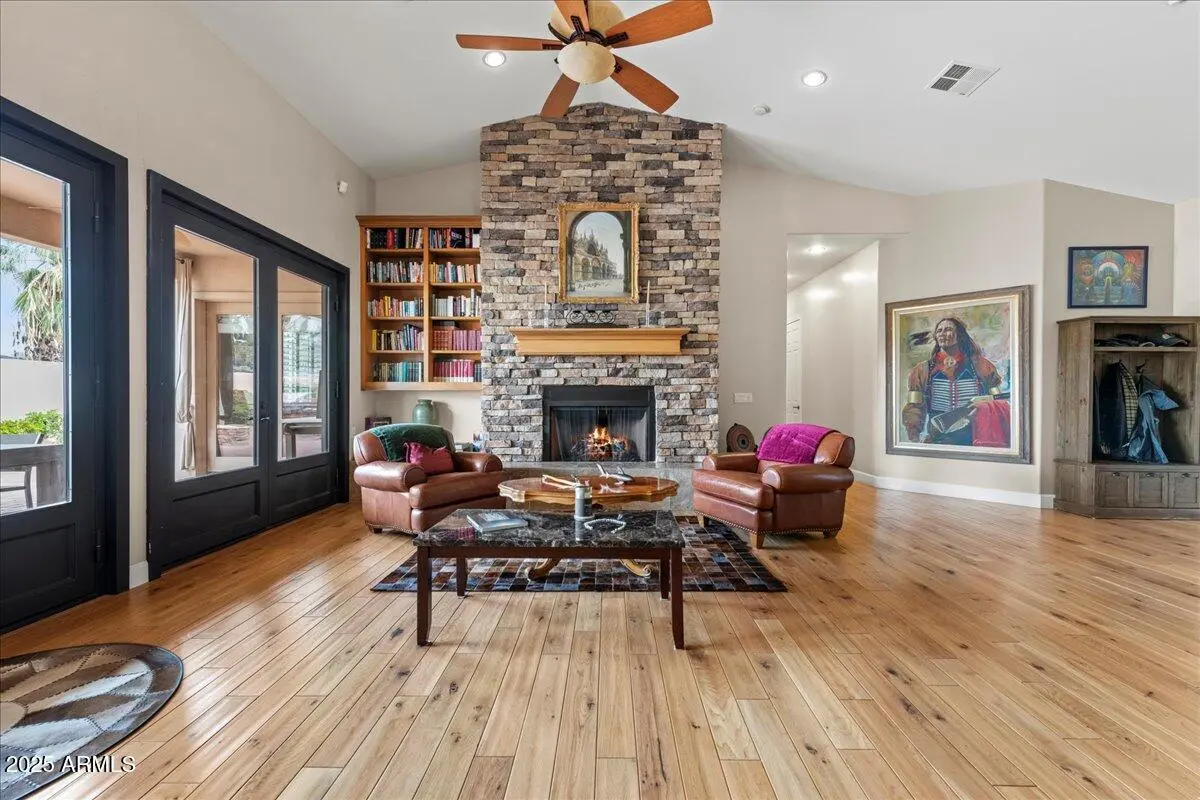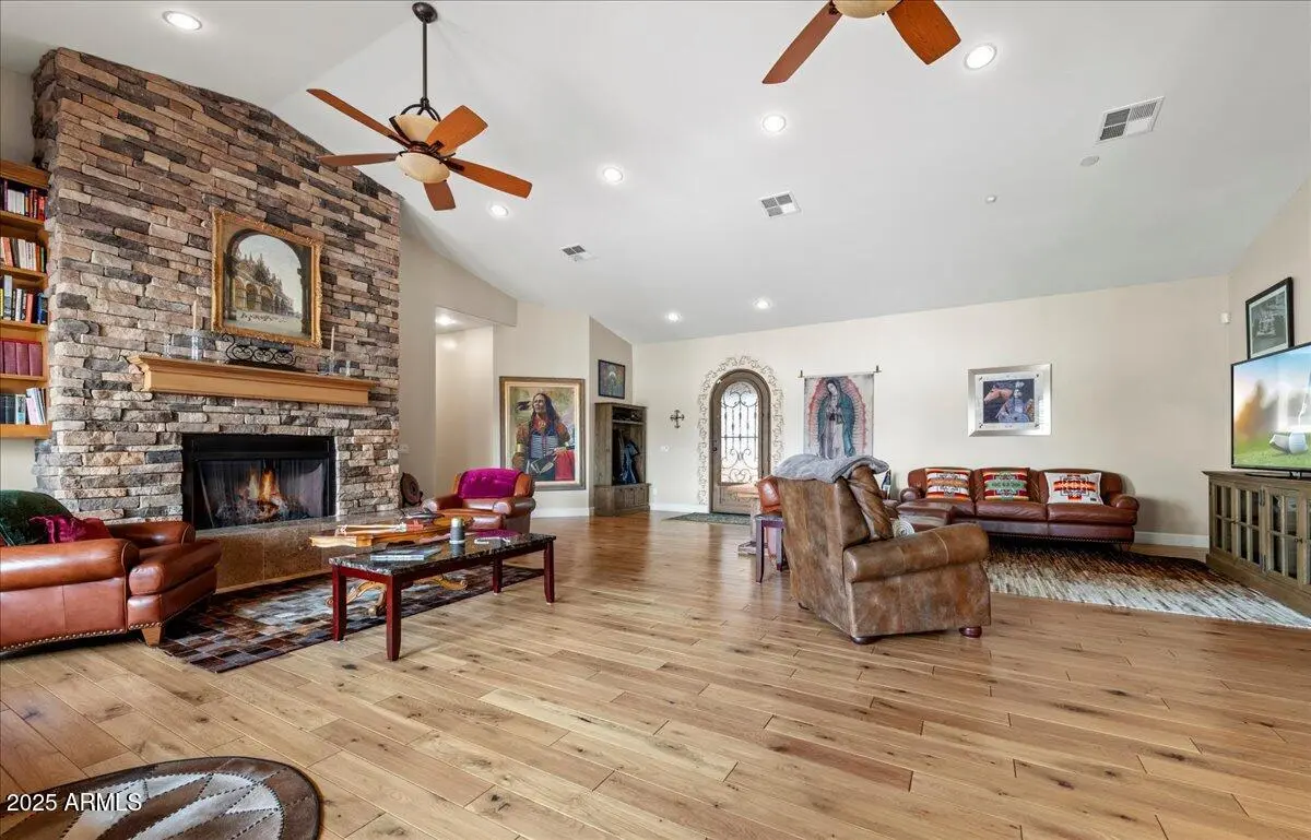 This lovely home has an open floor plan, spacious rooms, and a beautifully flow. Warm decorative tones, wood flooring, iron accents, large picture windows, and a stacked stone floor to ceiling fireplace combine to create a home that's charming and comfortable. Formal and informal dining areas and formal and informal living rooms offer multiple options for family gatherings and entertaining on any scale, and the brick paver covered backyard has a large covered patio, huge fireplace, custom built-in barbecue and bar, and a pool with waterfalls.