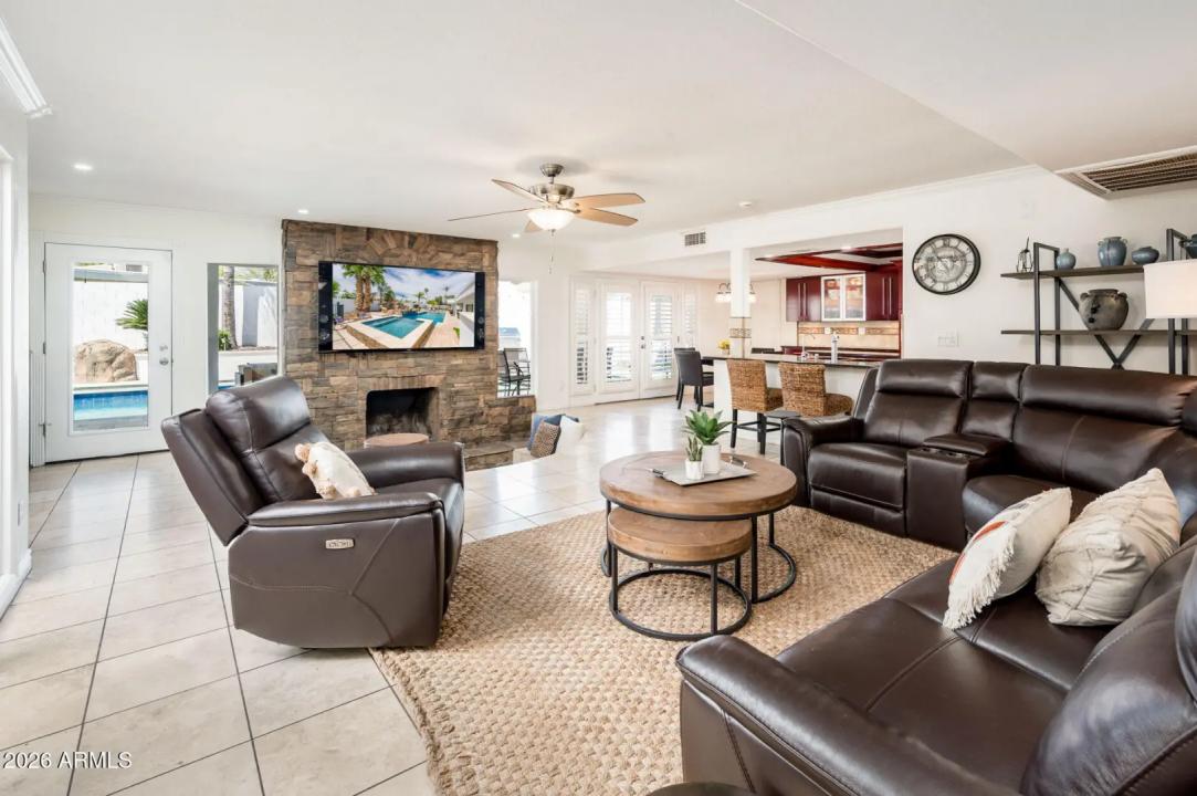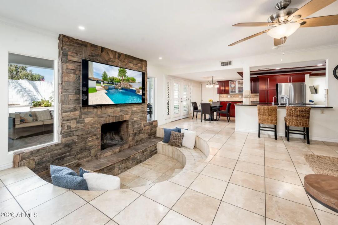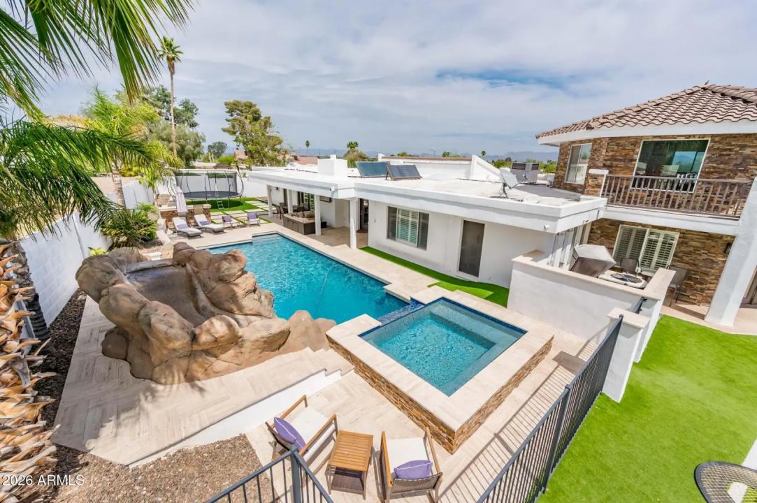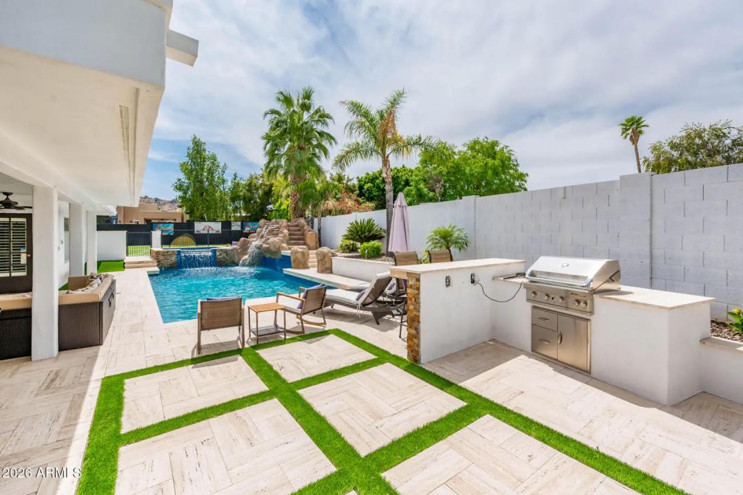 Welcome to your dream home, situated near the stunning Phoenix Mountain Preserve, where miles of scenic walking and hiking trails are just moments from your doorstep. This beautifully designed 4-bedroom, 2.5-bath residence offers an ideal balance of comfort, style, and outdoor living. Step into your private backyard oasis, featuring completely remodeled front and rear landscaping. Enjoy a fully refinished, heated pool with an exciting waterslide, a newly added spa with a 37-degree cold plunge feature, and a 25-yard lighted turf field--perfect for sports, pets, or relaxing under the Arizona sky. Entertain effortlessly with a built-in BBQ, outdoor fireplace, and expansive patio space that creates seamless indoor-outdoor living. Situated on a quiet cul-de-sac lot, this primarily single-level