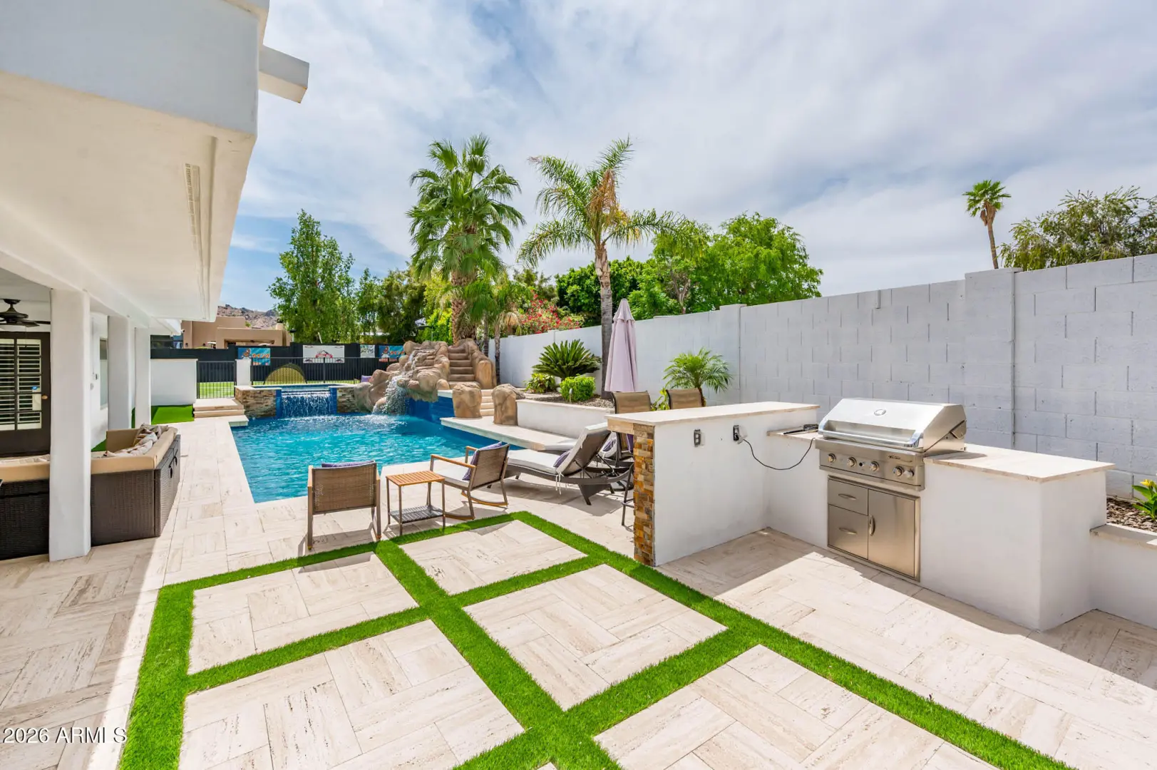 Welcome to your dream home, situated near the stunning Phoenix Mountain Preserve, where miles of scenic walking and hiking trails are just moments from your doorstep. This beautifully designed 4-bedroom, 2.5-bath residence offers an ideal balance of comfort, style, and outdoor living. Step into your private backyard oasis, featuring completely remodeled front and rear landscaping. Enjoy a fully refinished, heated pool with an exciting waterslide, a newly added spa with a 37-degree cold plunge feature, and a 25-yard lighted turf field--perfect for sports, pets, or relaxing under the Arizona sky. Entertain effortlessly with a built-in BBQ, outdoor fireplace, and expansive patio space that creates seamless indoor-outdoor living. Situated on a quiet cul-de-sac lot, this primarily single-level