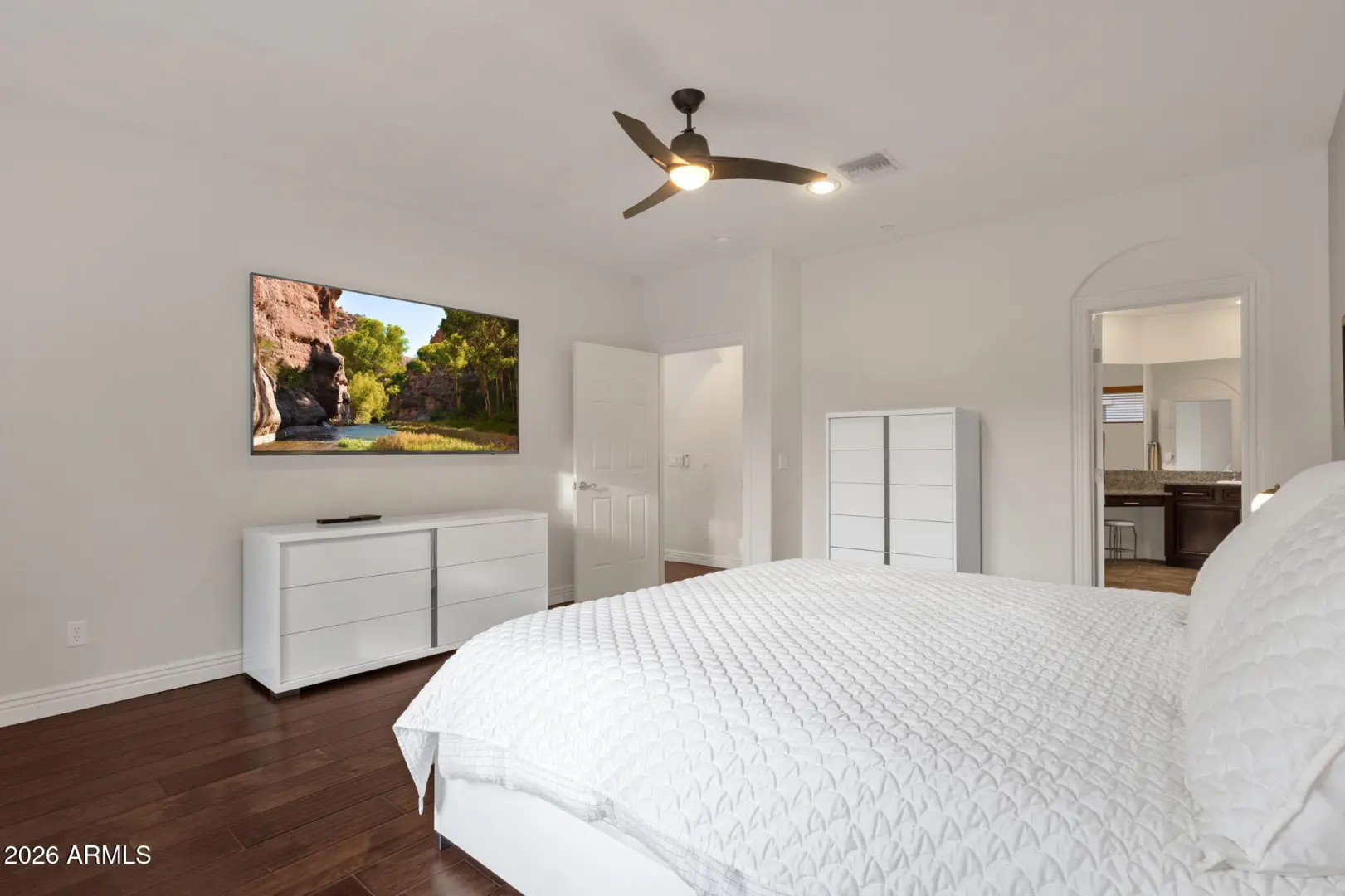 Beautiful and functional layout in gated Windgate Ranch. This 3,114 SF 4-bedroom home plus loft and den sits on a premium corner lot with only one neighbor. The primary suite and 4th bedroom are conveniently located on the main floor, while upstairs offers a spacious loft, two additional bedrooms, full bath, and a tucked-away den flex space. The large kitchen features a gas range, double ovens, walk-in pantry, and ample cabinetry for storage. The roof replaced in 2024 and one of HVAC's replaced in 2022. Windgate Ranch offers top-tier community amenities including a clubhouse, resort-style pools, and parks with tennis, pickleball, and basketball courts. This is your chance to enjoy both space and lifestyle in one of North Scottsdale's most desirable communities.